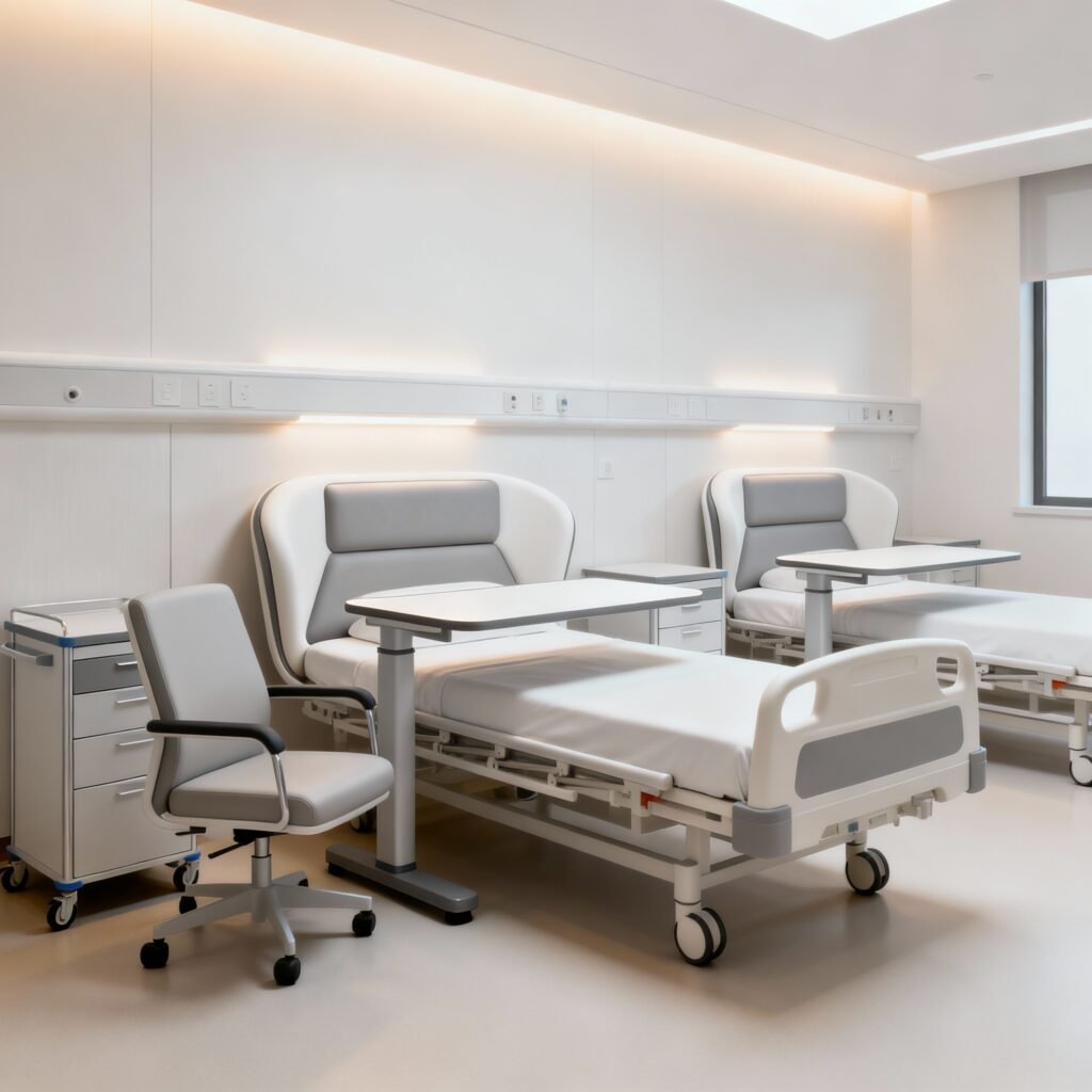 Ergonomic beds, trolleys, and seating designed for patient comfort and staff efficiency.